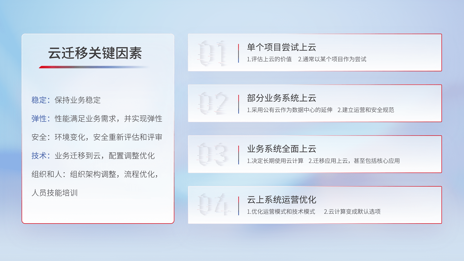 结合实际业务,,从规划设计、、云平台选型、、云原生改造、、数据迁移、、、集成交付,,,,迁移全过程为客户识别最佳上云路径,,,,做好风险识别管理,,设计网络架构、、、身份权限、、、安全审计合规、、、、操作审计、、、、日志审计、、、、监控告警策略、、、多站点容灾设计等,,对云上基础设施进行整体规划,,提升IT治理水平,,,,以满足弹性、、、、高可用、、、高性能的需求。。