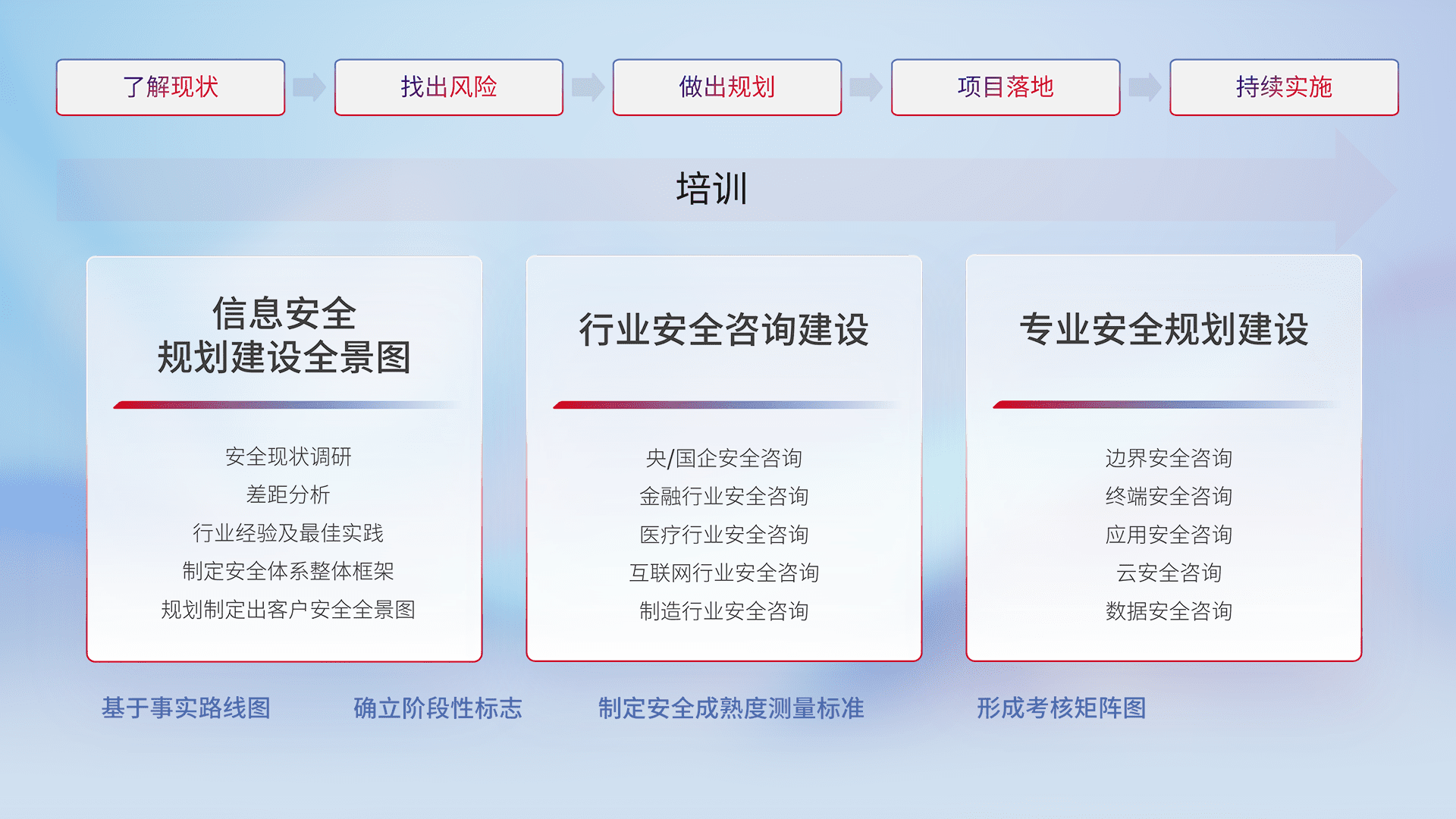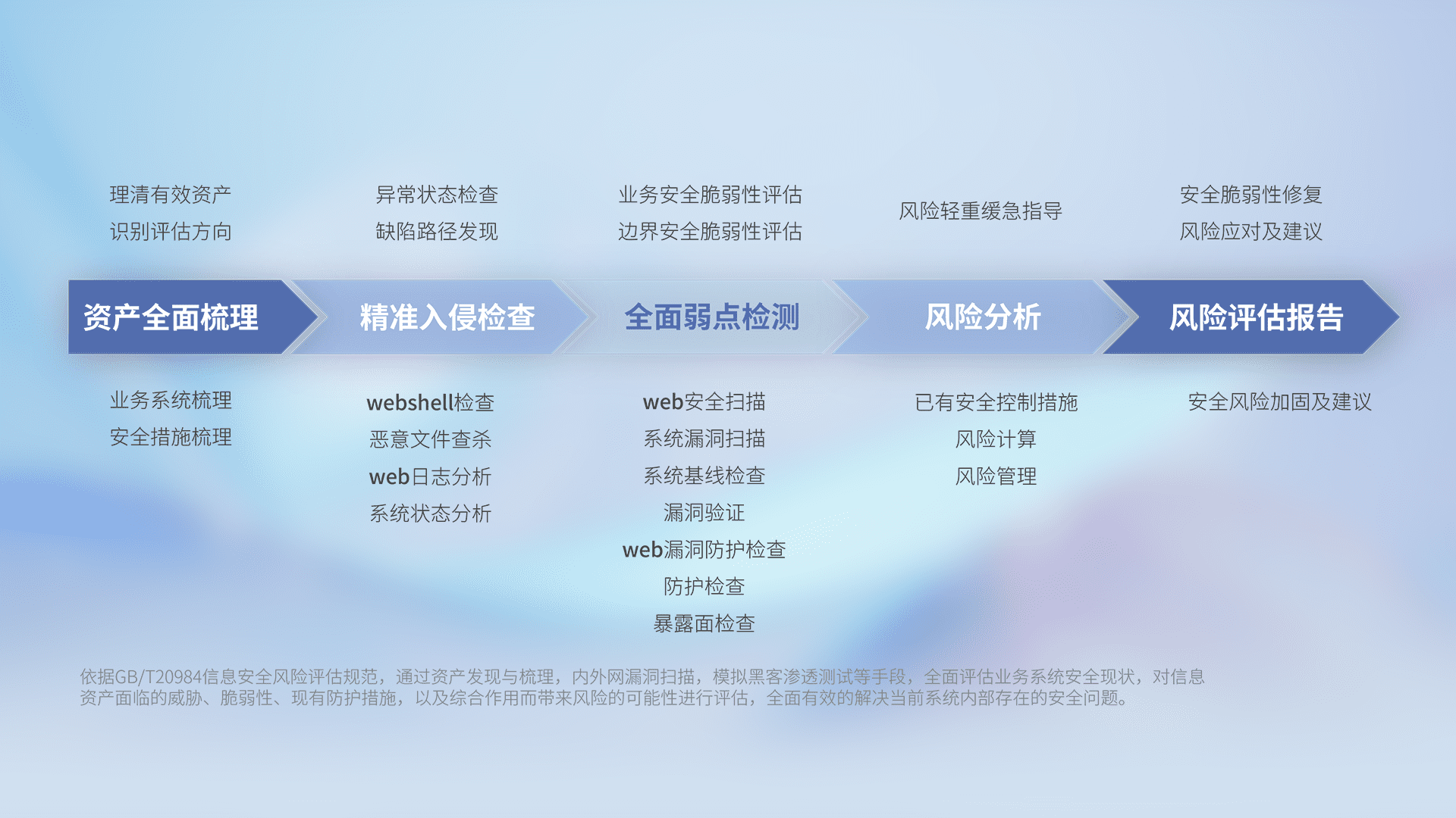 针对客户行业特性,,,以专业的安全服务+多厂商联合解决方案提供专属的一站式安全管理服务,,帮助客户全面感知网络空间威胁,,,,基于识别、、、检测、、分析、、、防护、、、监测、、响应的服务理论模型,,,,从方案咨询、、、、集成交付、、评估验证、、、优化加固、、、、运维运营,,,,致力于为客户提供完整的闭环管理式安全服务。。。。以实战经验为客户打造高抵御风险的安全体系,,,帮助客户发现威胁、、、对抗威胁、、、处置威胁,,不断积累安全对抗能力,,持续保障数字化安全。。。。